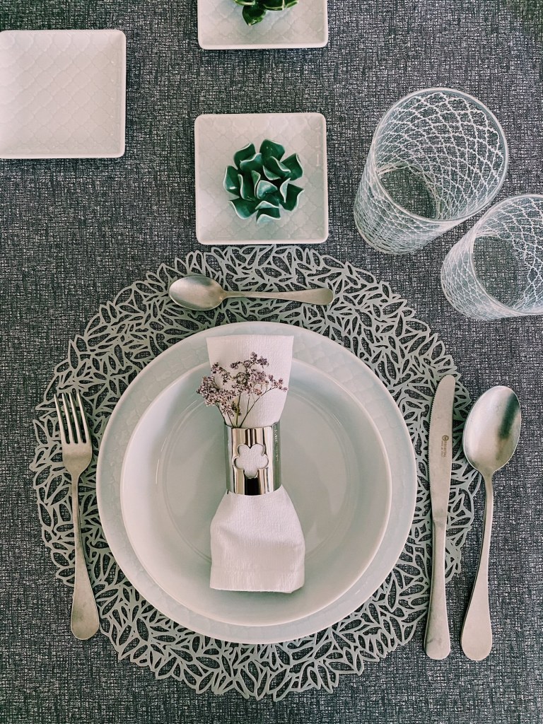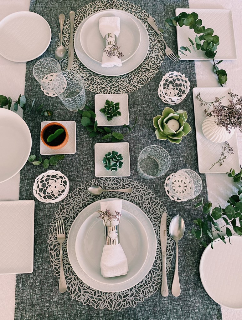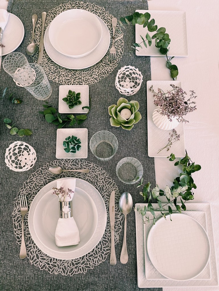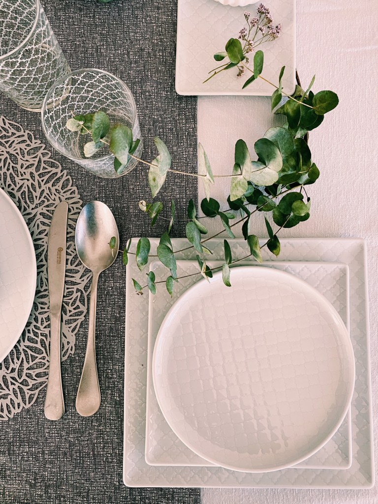 Qui ho giocato con l’accostamento del grigio del runner, delle tovagliette, delle posate e dei portatovaglioli con fiorellini rosa e elementi verdi dati dall’eucalipto e da fiori in ceramica.