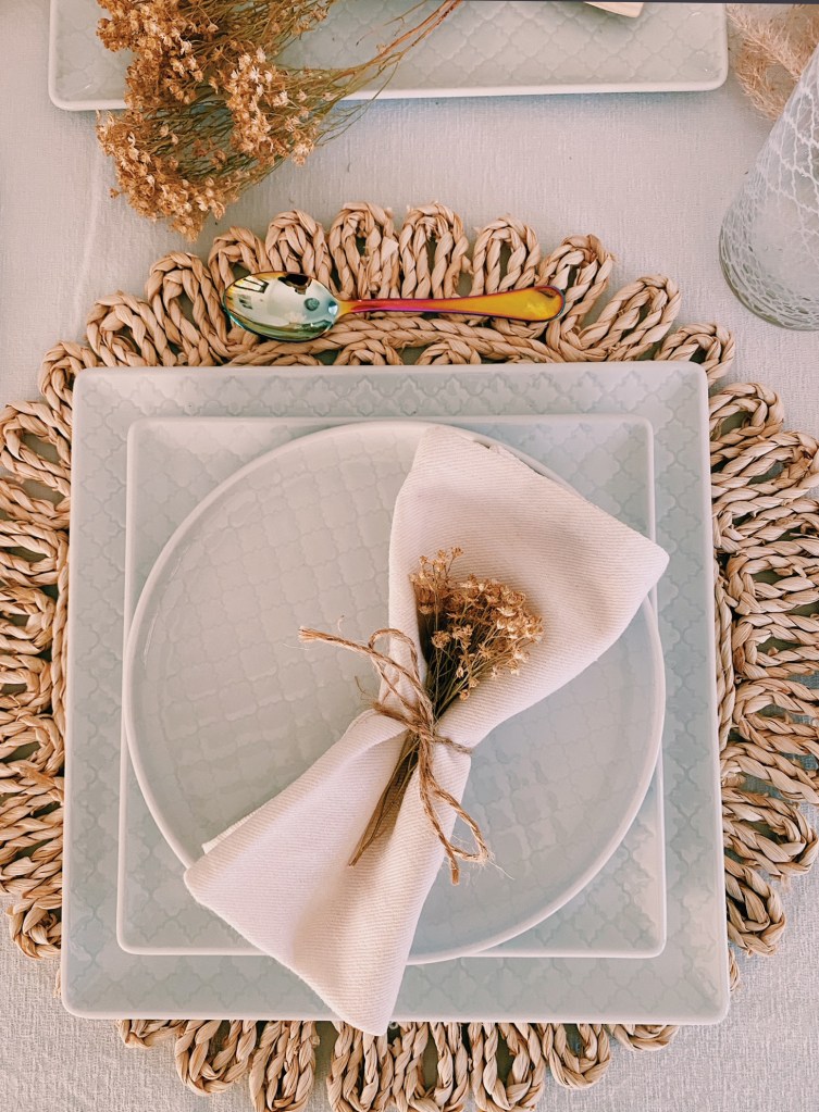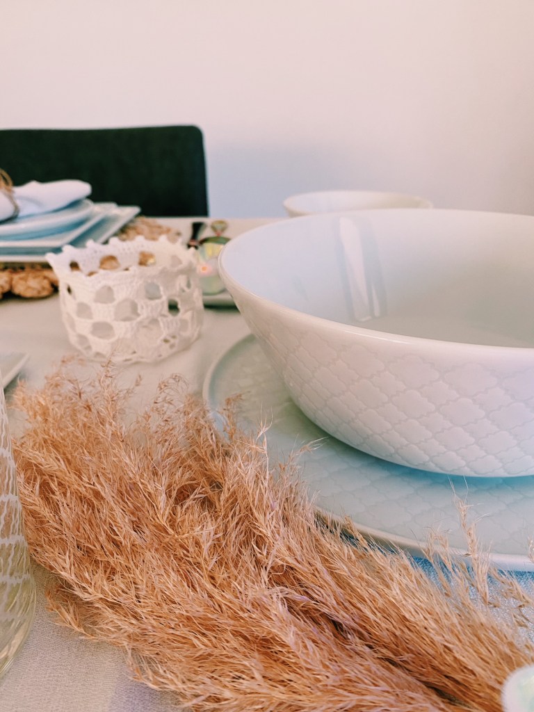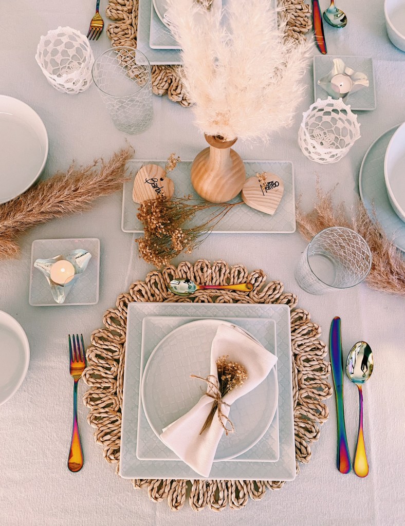 Per dare un tocco Boho alla tavola ho usato il bianco e i colori naturali e inserito sulla tavola pampas e fiori secchi, tovagliette di alghe, elementi in legno (il vaso sul vassoietto e i due cuori), le posate Sintesi Color Mix di Weissestal, cestini in centrino, tea light in vetro dicroico.